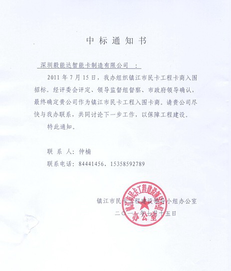 7月15日,在鎮江市民卡工程卡商入圍采購項目中,經評標委員會綜合評審毅能達公司以實力榮獲此項目的入圍中標資格。