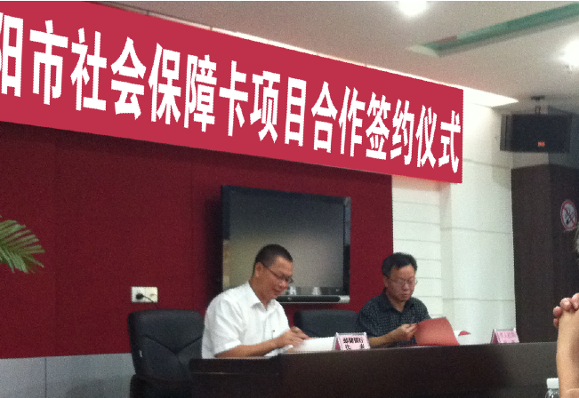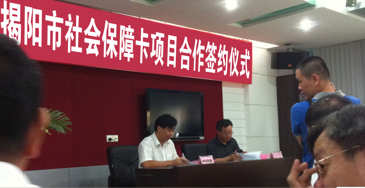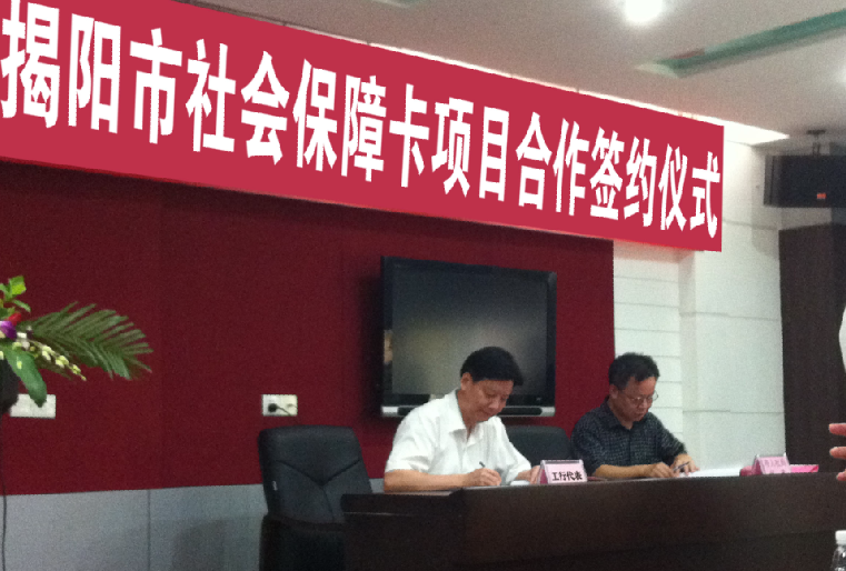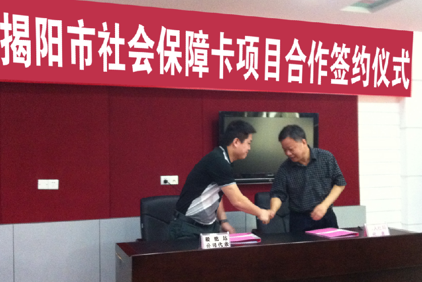 2012年8月10日,在揭陽市市人社局二樓舉行了揭陽市社障卡項目合作簽約儀式,揭陽市政府副秘書長邱偉澤、市委組織部副部長、市人力資源和社會保障局局長陳偉強、市人力資源和社會保障局與合作銀行、制卡企業等代表出度了簽約儀式。 |