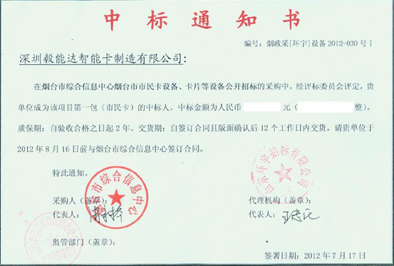 2012年7月17日,在煙臺市綜合信息中心煙臺市市民卡設(shè)備、卡片等設(shè)備公開招標的采購中,經(jīng)評標委綜合評定,毅能達公司以綜 合實力成為該項目第一包(市民卡)的中標人。