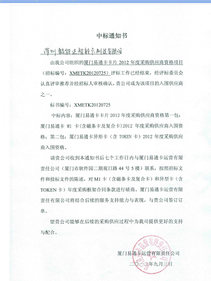 2012年9月3日,在廈門易通卡卡片2012年度采購供應商資格項目中,經評標委員會的綜合評定,毅能達成為該項目的入圍供應商一。